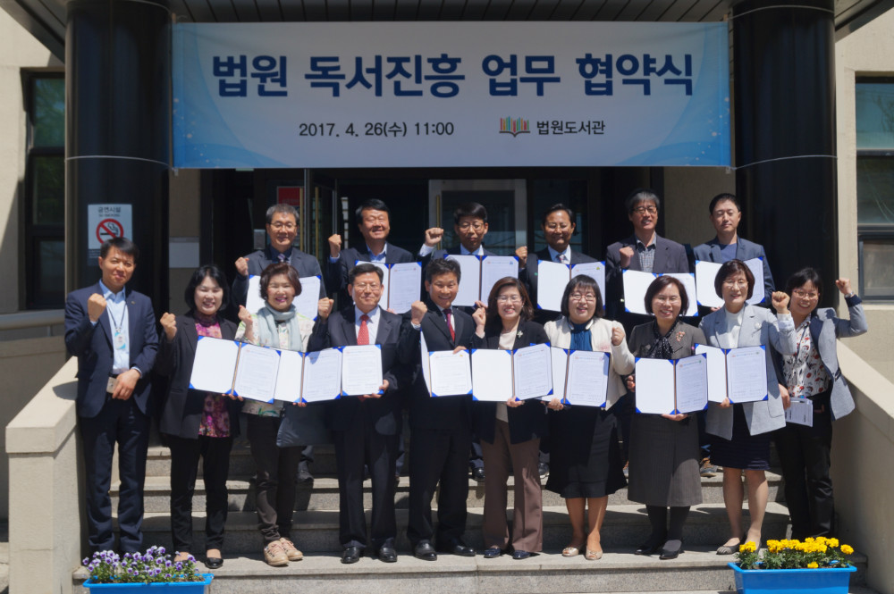 파주시 법원도서관 ‘독서진흥 업무 협약’ 체결 파주시 중앙도서관은 4월 26일 법원도서관에서 책 읽는 문화 확산을 위해 법원지역 인근 13개 기관단체와 독서진흥 업무협약을 체결했다. 이번 업무협약에서는 파주시 중앙도서관 분관인 법원도서관에서 인근의 8개 학교(천현초,웅담초,용연초,파평초,도마산초.율곡중고교.법원여중)와 5개 협력기관(세계로지역아동센터, 파주보육원, 별난독서캠핑장, 은빛사랑채, 다솜주야간보호센터)이 파주 법원, 광탄, 파평 지역의 독서문화 발전을 위해 상호 협력할 것을 약속했다. 이번 협약식에 참여한 기관단체는 법원도서관에서 진행하는 찾아가는 도서대출, 독서 및 진로교육, 책 읽어주기 등 평소 독서활동에 적극적인 참여과 유기적인 협조가 이뤄지는 기관이다. 이번 협약식을 통해 상호 협력을 더욱 단단히 하자는 데 의견을 같이 했다. 파주시 법원도서관 관계자는 “이번 업무협약을 계기로 14개 기관단체가 법원도서관을 중심으로 법원 독서진흥협의회를 구성하고 도서정보, 독서교육자료, 문화정보 교류와 협력을 강화해 지역내 독서문화 확산과 정착에 기여할 것”이라고 말했다.