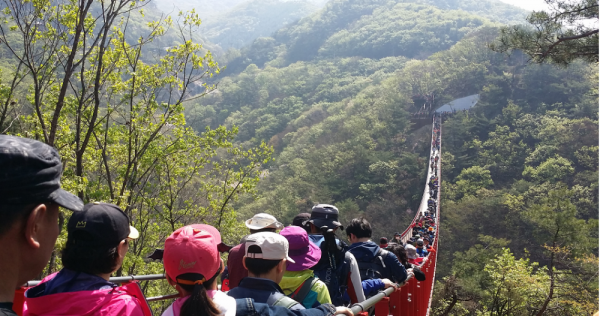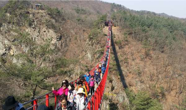 파주 감악산 출렁다리 방문객 50만 돌파 - 전국 지자체 벤치마킹 발길 줄이어 - 파주시는 지난 4월 23일을 기점으로 감악산을 찾은 방문객이 50만 명을 돌파했다고 26일 밝혔다. 이는 출렁다리가 임시 개통된 지난해 9월 20일 이후 7개 월만에 이룬 성과로 가을 성수기 뿐만 아니라 겨울과 봄에 이르기까지 방문객이 꾸준히 찾아준 결과다.