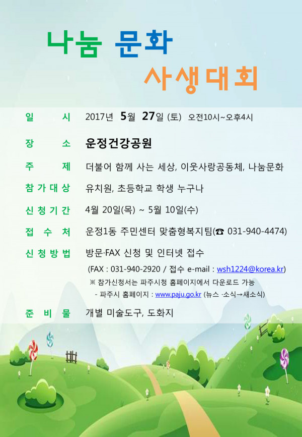 - 이웃사랑 나눔문화 확산을 위한 - 2017년 ‘어린이 사생대회’ 참가 신청 접수 파주시 운정권역 맞춤형복지팀이 어린이들이게 나눔문화에 대한 이해를 증진시키고 이웃과 함께사는 사회분위기를 조성하고자 ‘어린이 사생대회’를 오는 5월 27일 운정건강공원에서 개최할 계획이다. 이번 행사는 운정1동지역사회보장협의체가 주관하며 ‘더불어 함께 사는 세상’, ‘이웃사랑 공동체’, ‘나눔문화’를 주제로, 유치부와 초등부를 대상으로 열린다. 참가를 희망하는 대상자는 파주시 홈페이지(열린행정→새소식)에서 신청서식을 다운받아 5월 10일까지 운정1동 맞춤형복지팀(☎940-4474)에 접수하면 된다. 또한 제출된 작품 중 우수작품은 6월 8일에 개최 예정인 “이웃사랑 나눔문화제” 행사때 시상식을 갖고 어린이들에게 이웃사랑에 대한 희망과 꿈을 키워갈 수 있도록 동기를 부여할 계획이다. 운정1동 맞춤형복지팀 관계자는 “많은 어린이들이 사생대회에 참여할 수 있도록 지역사회의 관심과 협조를 당부드린다”고 말했다.