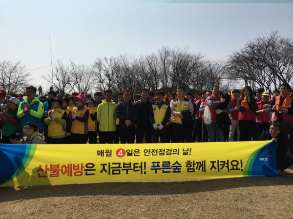 파주시, 제253차 안전점검의 날(산불예방) 행사 실시 파주시는 지난 14일 제253차 안전점검의 날을 맞이해 적성면 일원에서 유관기관 단체장, 공무원, 일반시민 등 400여명이 참여해 봄철 건조기 산불예방 홍보와 행락철 안전사고 예방을 위한 캠페인을 실시했다. 이날 캠페인은 안전문화의 핵심 수단인 점검, 교육, 신고를 중점으로 ▲산불 예방수칙 ▲산불 발생시 대처방법 ▲봄 행락철 안전사고 예방 및 유원시설 점검 ▲영농철 대비 농기계 안전사고 예방 및 교육 ▲안전신문고 홍보 등을 집중 홍보했다. 파주시 관계자는 “건조한 봄철이 돼 산불이 급증하는데 산불 원인의 18%를 차지하는 논․밭두렁 태우기 등의 사소한 실수가 돌이킬 수 없는 사고로 이어질 수 있으므로 시민들 모두가 산불 방지에 적극 참여해 주시기 바란다”고 말했다.