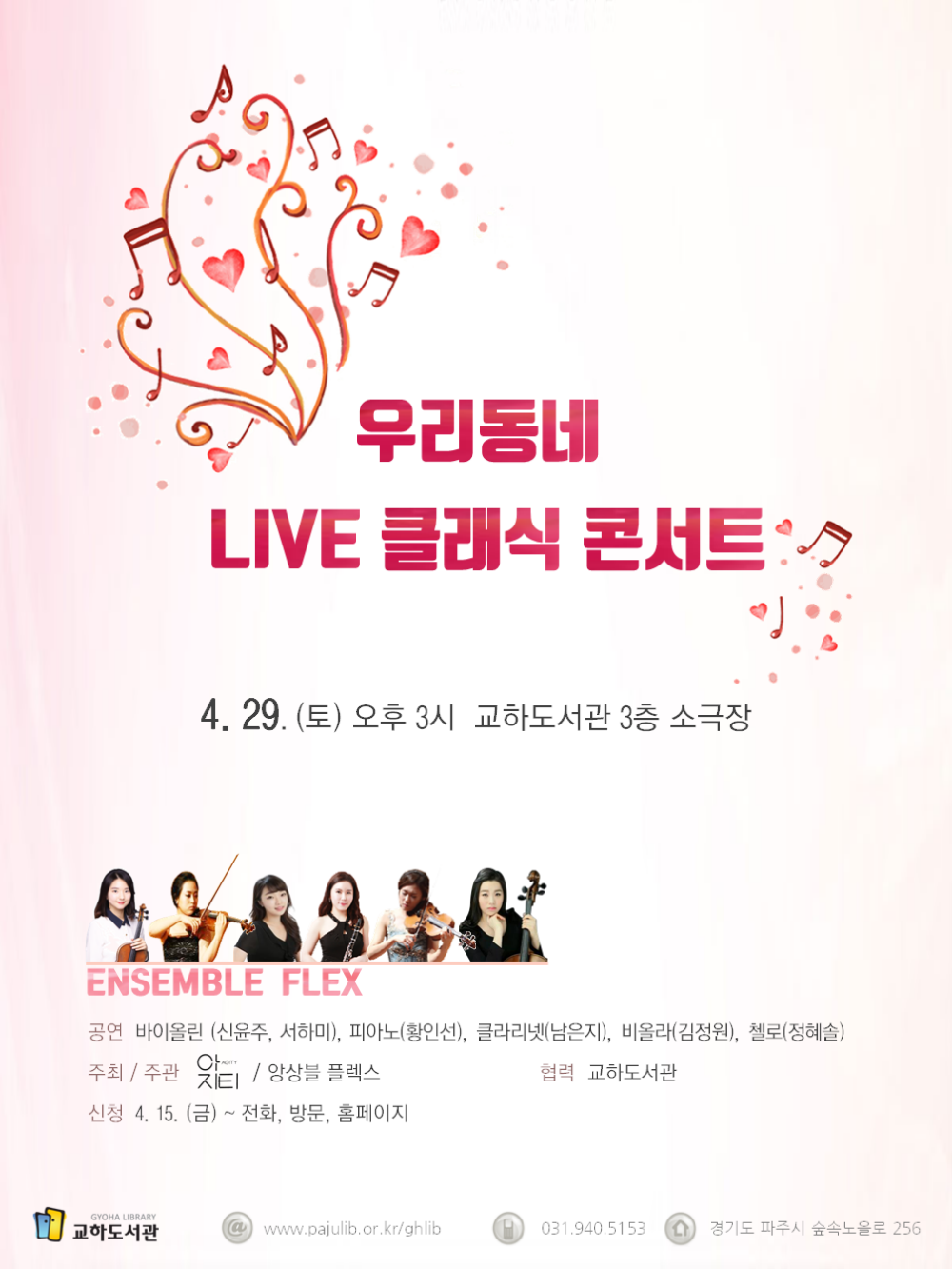 파주 교하도서관, 지역 예술단체와 협력해 문화컨텐츠 활용의 장으로 발돋움 파주시 교하도서관이 오는 29일 ‘우리동네 라이브 클래식’ 콘서트 개최를 시작으로 지역예술단체와의 협력해 예술가 역량강화와 문화콘텐츠 창작활동의 장으로 발돋움한다. 교하도서관은 지역과 함께 성장하는 도서관으로 다양한 유관기관들과 함께 문화를 공유하고 지역문화 선도에 앞장서왔다. 특히 올해는 지역문화콘텐츠의 성장과 발전에 포지션을 둬 시민의 삶 속에 문화가 일상적으로 스며들어 경험이 축적될 수 있도록 하는 ‘일상 속 문화(Some-Where-To) 프로젝트’를 시작한다. ‘일상 속 문화(Some-Where-To) 프로젝트’는 교하도서관의 문화공간을 활용해 지역예술가들의 지속적인 창작환경과 공간을 지원함으로써 시민들의 문화향유증진에도 도움이 되는 윈윈 전략으로 문화콘텐츠 성장의 밑거름이 될 것으로 보인다. 이번 첫 무대는 기획 단계부터 문화공동체로 움직이는 동네 카페 ‘아지티’와 지역예술단체인 ‘앙상블플렉스’와 함께 ‘우리동네 라이브 클래식’을 4월 29일(토) 오후 3시에 진행한다. 두 번째 무대는 7월 29일(토)에 열릴 예정이다. ‘우리동네 라이브 클래식’은 모차르트, 생상, 포레, 드뷔시, 드보르작 등 우리에게 친숙한 작곡가들의 대표적인 곡을 6인의 앙상블 연주자들의 완벽한 하모니와 친숙한 설명을 곁들여 진행돼 클래식공연의 진수를 느낄 수 있다. 교하도서관 관계자는 “어린이들을 동반한 가족단위의 참석자가 많을 것으로 예상돼 어린이를 위한 곡도 준비돼있다”며 “이런 공연으로 도서관 활용이 지역 예술인들의 자발적 움직임의 확대와 시민의 예술적 접근성이 향상되길 바란다”고 말했다. 자세한 사항은 교하도서관 홈페이지 또는 방문, 전화(031-940-5153) 등으로 문의하면 된다.