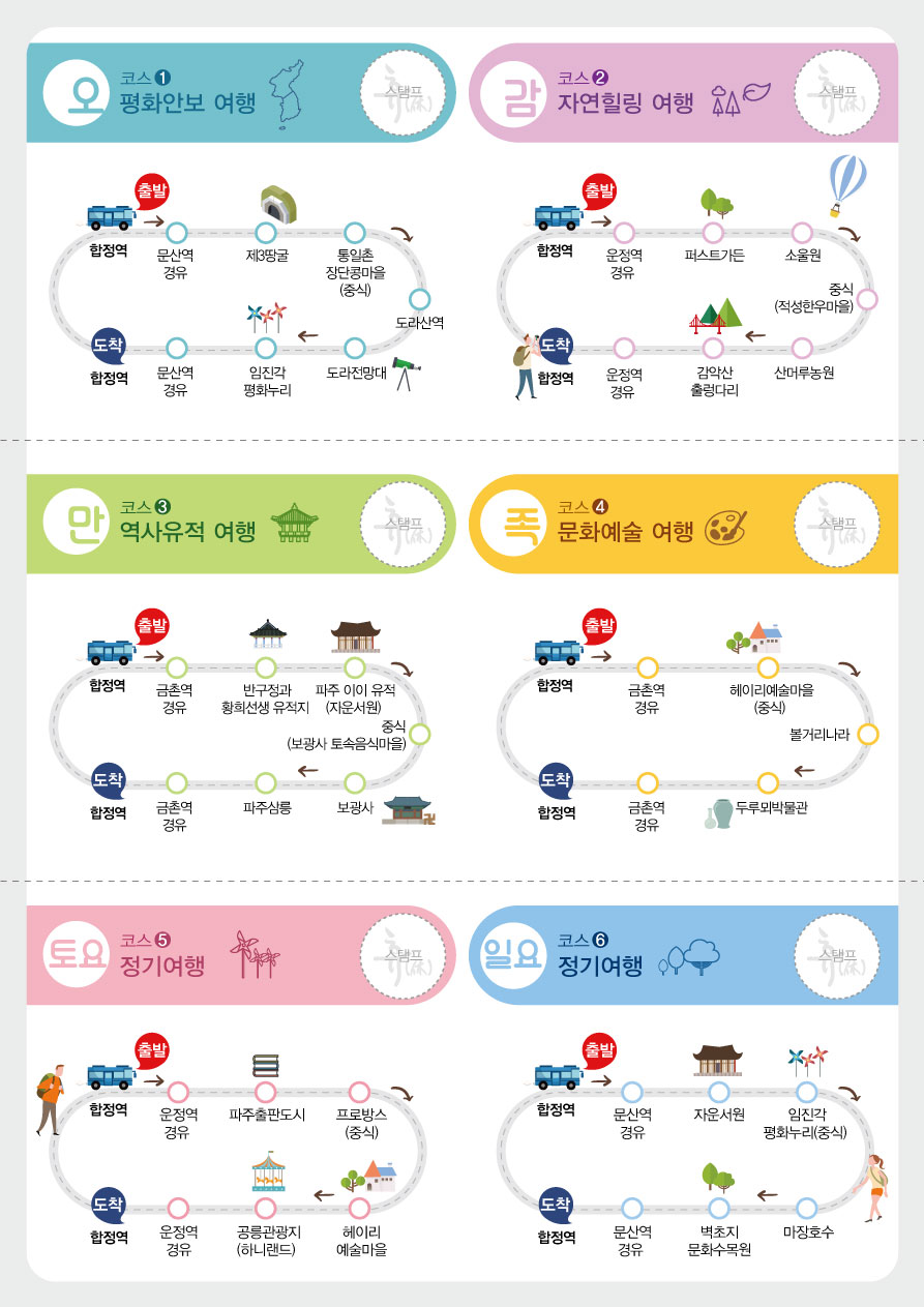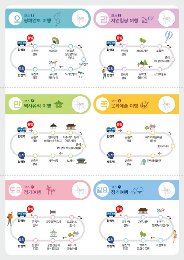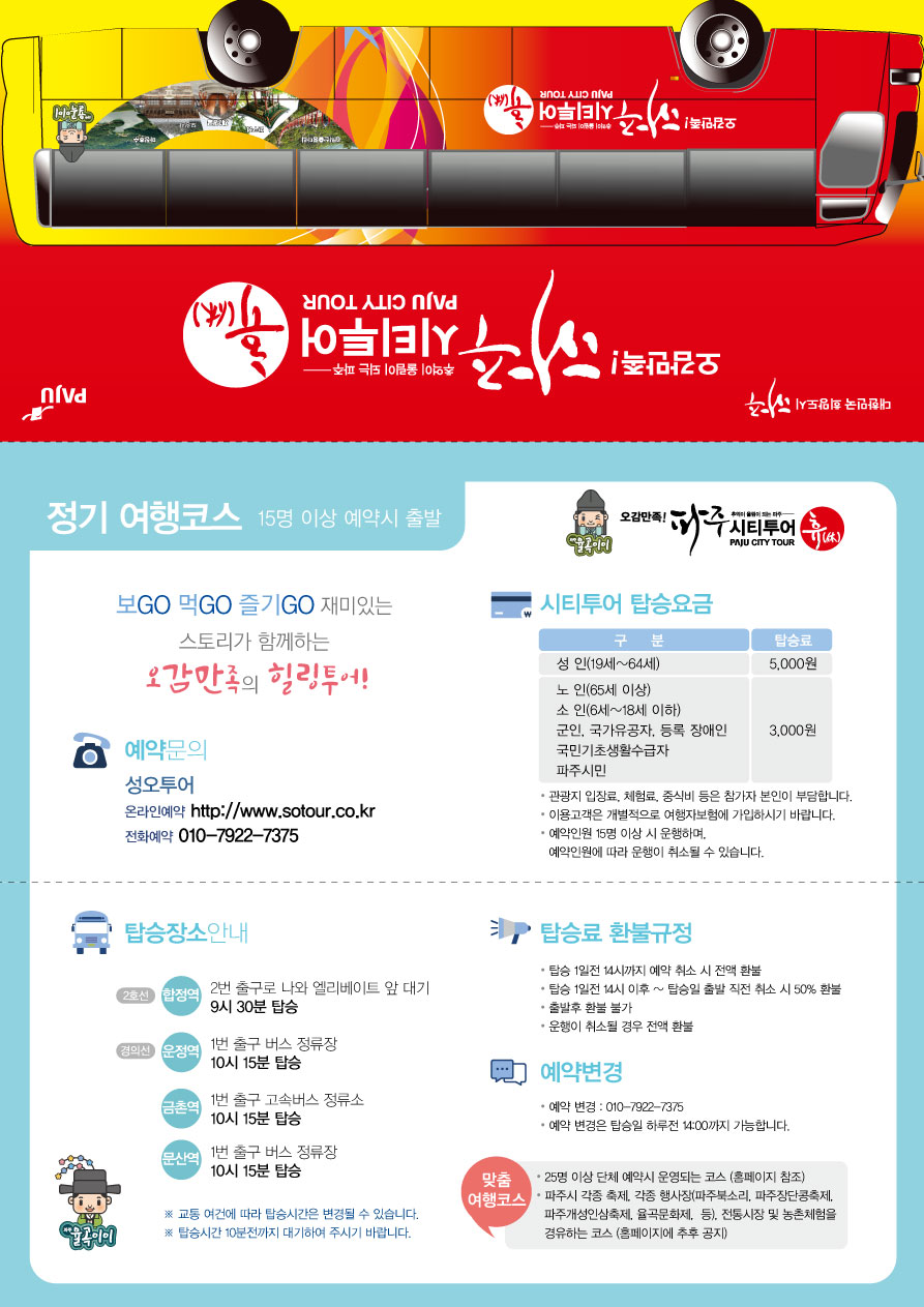 파주 시티투어 휴(休) 4월 15일부터 운행 시작 파주 주요 문화 관광지를 즐길 수 있는 파주시 시티투어 휴(休)가 오는 15일부터 본격 운행에 나선다. 파주 시티투어는 시내 주요 관광 명소와 문화 유산을 투어 코스로 연결해 매주 금, 토, 일요일에 코스에 따라 운행되는 파주시만의 힐링여행 사업이다. 앞서 지난해 5월부터 12월까지 파주 시티투어를 시범 운영해 2천여명의 관광객을 유치한 바 있다. 올해 파주 시티투어는 매주 금요일에 오감만족 기획코스가 운영된다. 오감만족 기획코스는 ▲1째 주 ‘평화안보여행(오)’ ▲2째 주 ‘자연힐링여행(감)’ ▲3째 주 ‘역사탐방여행(만)’ ▲4째 주 ‘문화예술여행(족)’ 등으로 구성됐다. 평화안보여행은 합정역~문산역~제3땅굴~통일촌(중식·두부체험)~도라산역~도라전망대~임진각을 방문하고 자연힐링여행은 합정역~운정역~퍼스트가든~소울원~적성한우마을(중식)~산머루농원(와인체험)~감악산(출렁다리) 코스로 이어진다. 역사탐방여행은 합정역~금촌역~반구정~자운서원~보광사부근(중식)~보광사~파주삼릉 등을 가고 문화예술여행 코스는 합정역~금촌역~헤이리예술마을~헤이리(중식)~볼거리나라~두루뫼박물관 등으로 짜여졌다. 각 코스별로 다양한 관광명소를 방문하기 때문에 본인이 원하는 코스를 선택해 이용할 수 있다. 매주 토·일요일에는 시티투어 정기코스가 운영된다. 토요정기코스는 합정역~운정역~출판도시~프로방스(중식)~헤이리예술마을(프리마켓)~공릉관광지이며 일요정기코스는 합정역~문산역~자운서원~임진각(중식)~마장호수~벽초지수목원이다. 파주시는 시티투어 비운행기간인 12~3월 중에 장단반도에서 독수리 먹이주기, 철새 도래지 답사 등을 특별 기획해 진행할 예정이다. 파주 시티투어 탑승요금은 5천원이며 입장료, 중식, 여행자보험료 등은 미포함된 금액이다. 특히 파주 시민 또는 할인요금 적용대상자(단체, 경로)는 3천원에 이용할 수 있다. 시티투어 탑승 장소는 오전 9시30분 합정역 2호선 2번 출구, 오전 10시 15분 금촌역, 문산역, 운정역 1번 출구다. 파주 시티투어에 관한 예약 문의 및 자세한 내용은 파주시 문화관광과(031-940-8516) 또는 성오투어 홈페이지(www.sotour.co.kr)로 문의하면 된다.