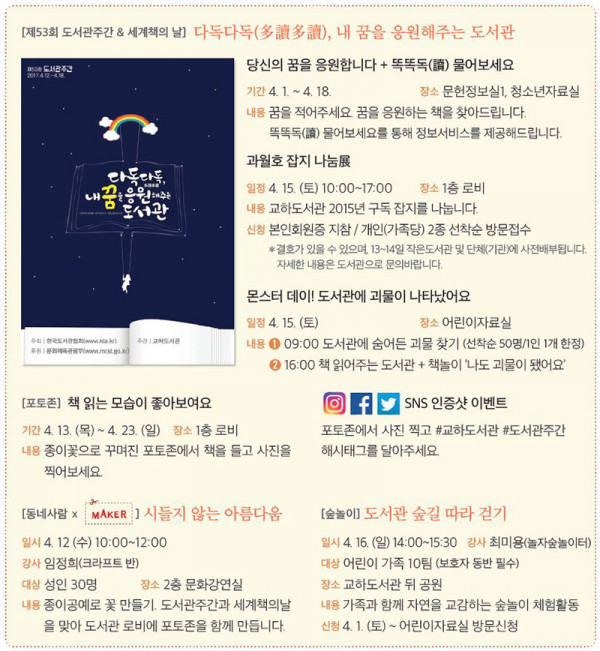 파주시 교하도서관이 제53회 도서관주간(4월12~18일)과 세계의 책(4월23일)을 맞아 ‘다독다독(多讀多讀), 내 꿈을 응원해주는 도서관’을 주제로 다양한 독서프로그램과 이벤트를 마련한다.