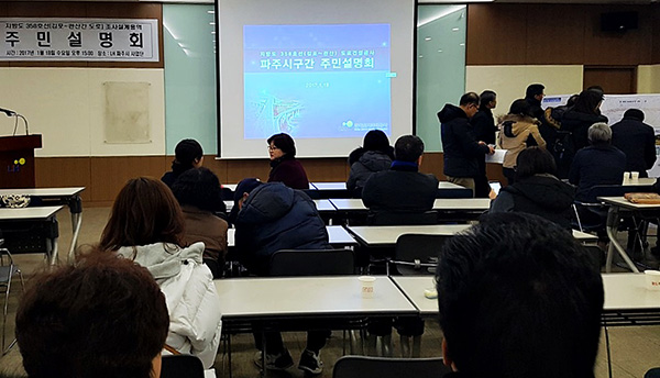 한국토지주택공사(이하 LH공사)는 1월19일 파주사업본부 대회의실에서 운정신도시 광역교통개선대책의 일환으로 추진하고 있는 지방도358호선(김포~관산간) 도로건설 사업에 대한 주민설명회를 개최했다.