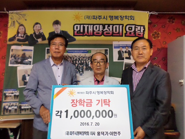 지난 20일 (재)파주시행복장학회 이사회에서 임원으로 활동 중인 홍덕기(前 파주시의원) 이사와 이한주(現 파주시자원봉사센터장) 이사가 각각100만원씩 200만원을 지역 인재육성에 써 달라며 (재)파주시행복장학회(이사장 황용순)에 전달했다.